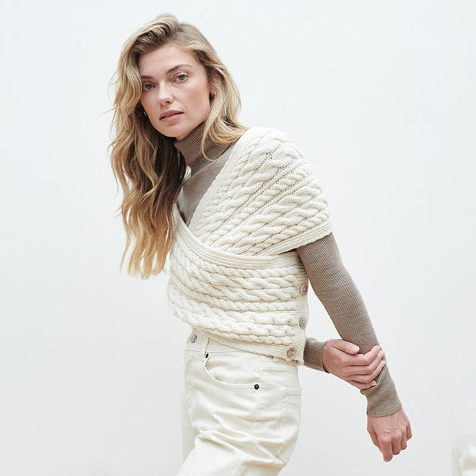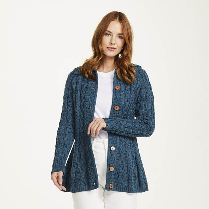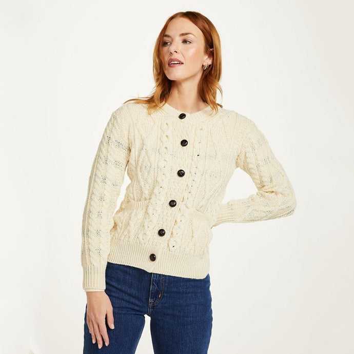 Tara Irish Clothing offers the finest selection of women's Irish sweaters and cardigans in traditional and modern designs available for delivery worldwide. Each and every women’s fisherman sweater is made in Ireland using the finest quality 100% merino wool. Very pleasant and soft to the touch, merino wool is known for its water-repellent properties that will keep you dry, making each sweater very comfortable to wear. It is both very warm and perfectly breathable so, due to its properties, the exquisite feel of the merino wool offers long-lasting comfort to the wearer. Our stunning Irish knitwear range for ladies comes in a large variety of styles, starting with the classic crew neck sweater, V-neck sweater to merino knit Aran vest and knit cardigans. The detailing, neck and sleeve styles and Aran knit patterns are elements that come in endless combinations, making each piece truly unique. From the classic cable knit crew neck sweater to the sophisticated turtleneck style wool sweater, an Aran sweater can be styled in any manner, as it is truly timeless and full of unique and authentic Irish charm. The quality of the sweaters and cardigans we offer cannot only be felt but can also be seen. It will be noticed by everyone everywhere you go. Not only will people appreciate the quality, but also the immaculate style. When it comes to style, a ladies' Irish wool sweater is guaranteed to be the perfect addition to your wardrobe, as it is very versatile and can be styled in multiple ways. By pairing it with other articles of clothing and accessories, you can create looks from casual to very elegant. Whatever your style is, our selection of women’s Aran sweaters has something to suit every taste and occasion.